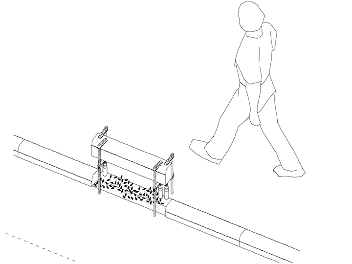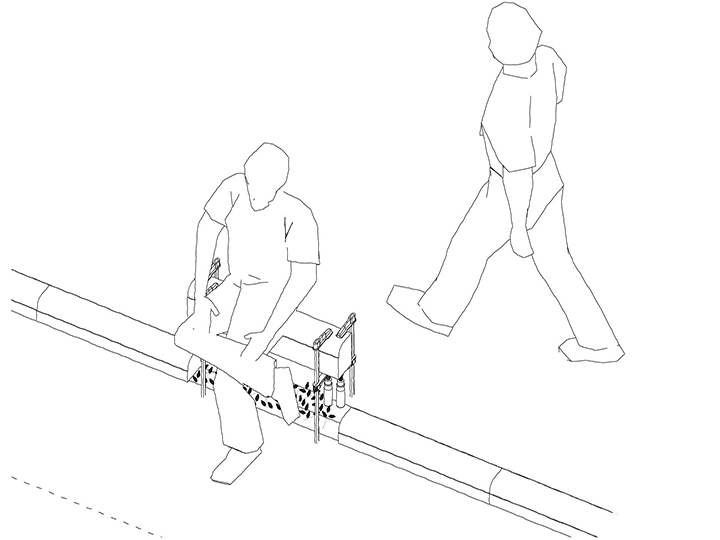 A temporary bench from a curbside and 4 glue clamps which reveals green nder the concrete.(1/3)